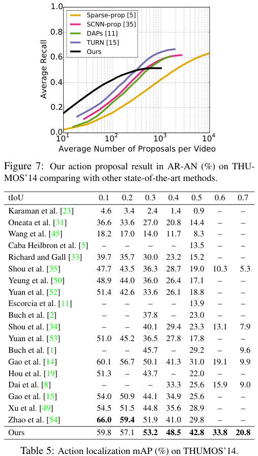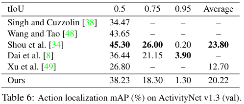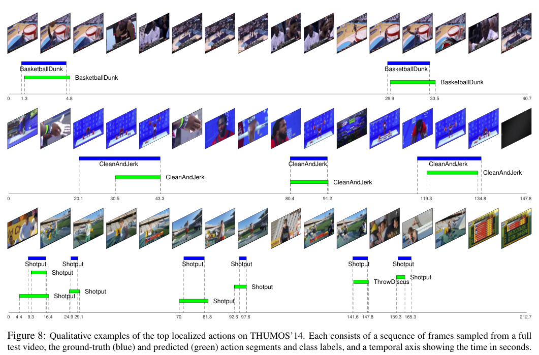 한편 ActivityNet에서는 다른 모델들에 비해 유독 좋지 못한 성능을 내고 있다. 이 부분에 대하여 저자들은 THUMOS'14 데이터셋이 평가에 더욱 적합하다는 말을 짤막하게 하는데, 해당 데이터셋에서 성능이 낮은 것에 대한 별다른 설명이 없어 아쉽다.
