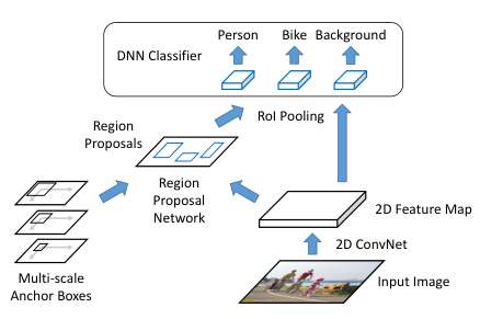 먼저 TAL-Net의 기반이 된 Faster R-CNN 구조를 되짚어 보자. Faster R-CNN은 어떤 이미지 내부에서 물체의 위치 정보를 알아내는 것을 목적으로 한다. 먼저, 입력 이미지에서 2D ConvNet을 이용해 2D feature map을 생성한 후, 이를 Region Proposal Network(RPN)라 하는 2D CNN에 입력한다. 이 신경망은 사전에 정의된 다양한 크기의 앵커(anchor) 들을 이용하여 물체가 있을 것으로 추정되는 영역을 제안한다. 이때, 물체의 예상 boundary 또한 앵커 박스에 상대적인 크기로 회귀를 이용하여 얻어진다 그다음, 제안된 각 영역들에서 고정된 크기의 feature map을 풀링(RoI Pooling)하여 이를 이용해 각 물체의 클래스를 판별한다.