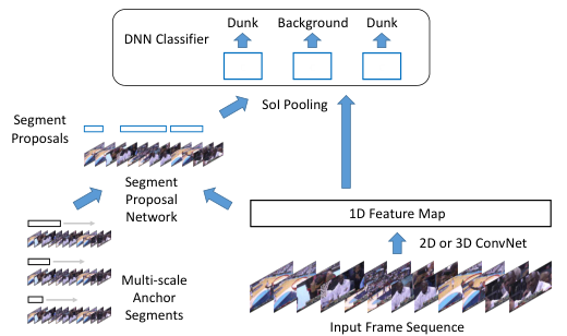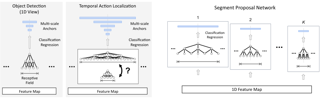 물체의 2D 위치 정보를 파악하는 Object Detection과 어떤 action의 1D 시간 정보를 파악하는 Temporal Action Localization은 유사하다. 위 그림과 같이 이를 Object Detection 모델 형태로 나타낼 수 있다. 이 방법 또한 Object Detection과 유사하게 두 단계로 나타낼 수 있다. 먼저, 주어진 frame sequence에서 1D Feature Map을 추출하여 1D CNN인 Segment Proposal Network에 입력한다. 그 다음, 1D RoI Pooling과 DNN을 통해 각 proposal에 대한 classification을 수행한다.