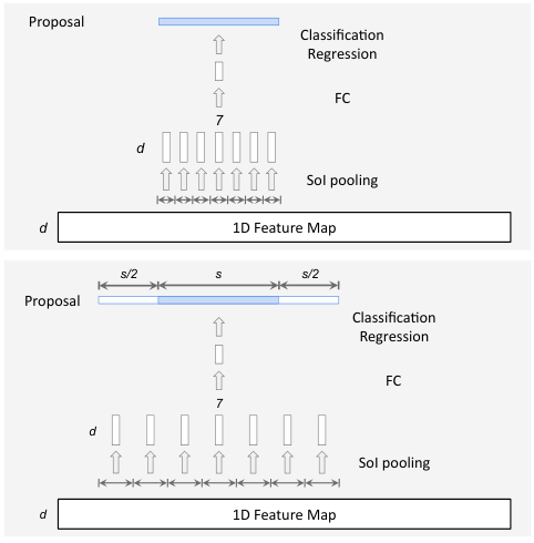분류 단계에서는, 앞서 얻은 proposal들로부터 고정된 크기 $7$의 feature map을 얻기 위하여 SoI Pooling을 수행하였다. 이때, 위 그림의 하단에 표기된 것처럼 $s$ 크기의 proposal에 대하여 앞뒤로 $s/2$의 영역을 추가로 pooling하여 context 정보를 추가했다. SoI Pooling이후, 저자들은 FC 계층 2개를 통해 최종적으로 action classification과 boundary regression을 수행하였다.