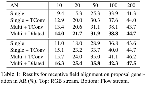 저자들은 실험(표 1)을 통해 Receptive Field Alignment의 효과를 확인했다. temporal convolution 없는 Single-Tower network를 통해 각 앵커가 오직 앵커의 중심부 feature만을 고려하여 예측을 수행한 결과 가장 성능이 좋지 않았고, Temporal Convolution, 특히 Dilated Temporal Convolution을 수행한 결과가 가장 좋았다.