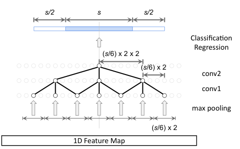 Faster R-CNN에서는 Feature Map에 $K$개의 앵커에 해당하는 $K$개의 채널을 갖는 $1\times 1$ 합성곱을 진행하여 각 채널의 한 픽셀 값을 해당 위치의 특정 앵커 속 물체의 존재 확률로 보아 앵커를 적용했다. 이러한 방법은 Object Detection에서는 괜찮지만, action의 길이가 가질 수 있는 범위가 넓은 영상에서는 모든 앵커가 같은 receptive field를 갖는 것이 안 좋을 수 있다. receptive field는 너무 작거나 커서는 안되며, 다양한 스케일을 가져야 한다.