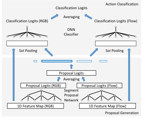 (논문 당시) 최근에는 Region 기반 object detector의 성공에 따라 영상에서도 먼저 관심 영역을 추출하고 이에 대한 분류를 수행하는 2-stage 방법들이 많이 연구되었다. 이러한 연구들은 대부분 segment proposal의 성능을 향상하거나 classification 성능을 향상하는데 집중하였다. 그러나 이러한 방법들은 대부분 end-to-end 학습이 불가하고, 정해진 크기의 sliding window를 사용하여 다양한 길이의 action을 잡지 못하는 단점이 있었다. 그나마 R-C3D는 Faster R-CNN의 설계를 충실히 이식하여 좋은 성능을 내기는 하였다.