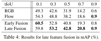 마지막으로 저자들은 각 모달의 성능과 Fusion 방법에 따른 성능 차이를 확인하였다. Fusion을 수행한 결과 중 Late Fusion이 Early Fusion보다 일반적으로 좋았다. tIoU가 0.1인 경우 Early Fusion이 좋았지만, 이는 예측의 질이 떨어짐을 의미하므로 대체로 저자들이 제안한 방법이 좋다고 할 수 있겠다.