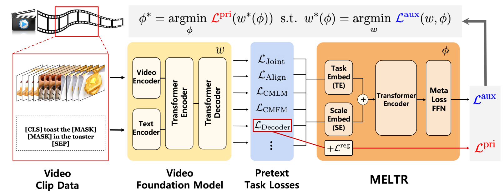 이 논문이 상당히 흥미로웠는데, 기존의 비디오 Foundation Model들은 여러 가지 task에 사용되는 Loss들을 조합하여 학습한 후, fine-tuning 할 때는 downstream task에 해당하는 Loss만 이용해 학습하였다. 저자들은 fine-tuning 단계에서 primary task가 아닌 이 task들에 해당하는 loss들을 버리는 것에 의문을 갖고, 이들을 transformer를 통해 병합하여 Auxiliary Loss를 만들어 학습에 활용하였다. 이를 통해 downstream task의 loss만 사용하는 것보다 좋은 fine tuning 결과를 얻을 수 있었다고 한다.