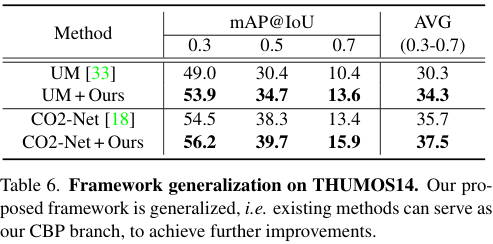 저자들은 제안한 구조가 일반적으로 좋은지 확인하고자 다른 W-TAL 방법들로 CBP를 대체하여 실험을 수행하였습니다. 그 결과, 저자들이 제안한 구조를 기존 모델들에 적용하자 성능이 오르는 것을 확인할 수 있었습니다.