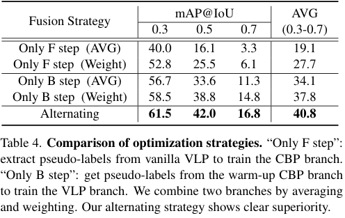 다음은 학습 방식에 따른 성능 비교입니다. Only F step은 vanilla VLP에서 foreground pseudo-label을 추출하여 CBP 브랜치를 학습하는 F step만 진행한 결과이고, Only B step은 반대로 CBP에서 얻은 background pseudo-label로 VLP 브랜치만을 학습한 결과입니다. 각 방법에 대하여, 두 브랜치의 결과를 평균하거나 가중합하여 결과를 얻었다고 합니다.