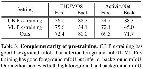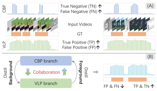 본 논문에서는 W-TAL에서 incomplete 문제가 있는 Classification Based Pre-training (CBP) 브랜치와 over-complete 문제가 있는 Vision-Language Pre-training (VLP) 브랜치를 상호 보완적으로 번갈아 distillation 시켜 좋은 성능을 달성했습니다.