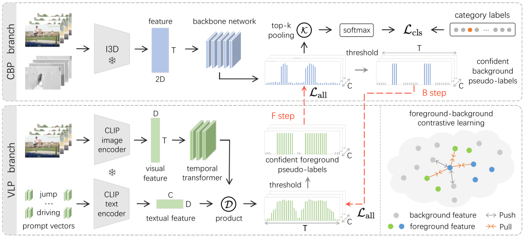 VLP 브랜치는 CLIP과 같은 VLP 모델에서 free action knowledge를 추출하고자 합니다. VLP 모델은 action의 classification이 아닌 임베딩을 위해 학습되었기 때문에 CBP에 비하여 액션과 잠재적으로 유사한 프레임들까지 잘 잡아내는 경향이 있지만, 영상이 아닌 이미지에서 학습되었기 때문에 temporal information이 상대적으로 부족하여 너무 많은 영역을 액션으로 분류하는 over-complete 문제도 가지고 있습니다.