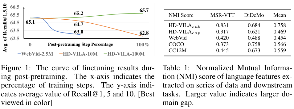 표 1. 을 보면 HD-VILAsub와 downstream 데이터의 NMI가 다른 것들에 비해 큰 것을 볼 수 있는데요, 이는 자막을 이용한 사전학습이 좋지 않을 수 있음을 시사합니다.