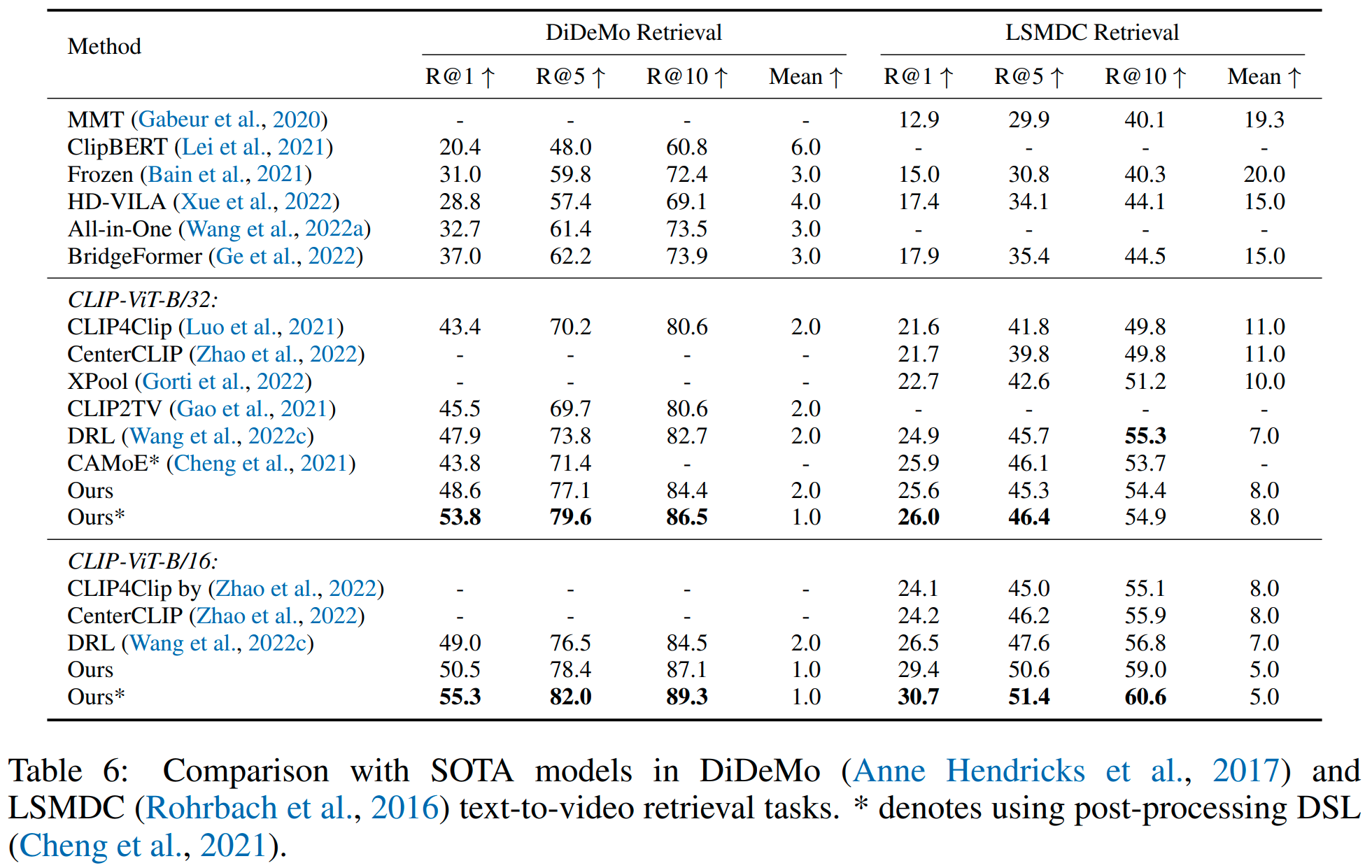 저자들은 제안한 CLIP-ViP와 기존 모델들의 DiDeMo, LSMDC Text-to-Video Retrieval 성능을 비교하였습니다. (이때, 파인튜닝은 MSR-VTT, DiDeMo, ActivityNet Captions, LSMDC에서 진행됐다고 합니다.) CLIP-ViP는 CLIP-ViT-B/32와 CLIP-ViT-B/16 기반 모델 중 SOTA를 달성하였으며, 일부 기존 방법들을 CLIP-ViP에 추가한다면 추가적인 성능향상도 기대할 수 있다고 합니다.
