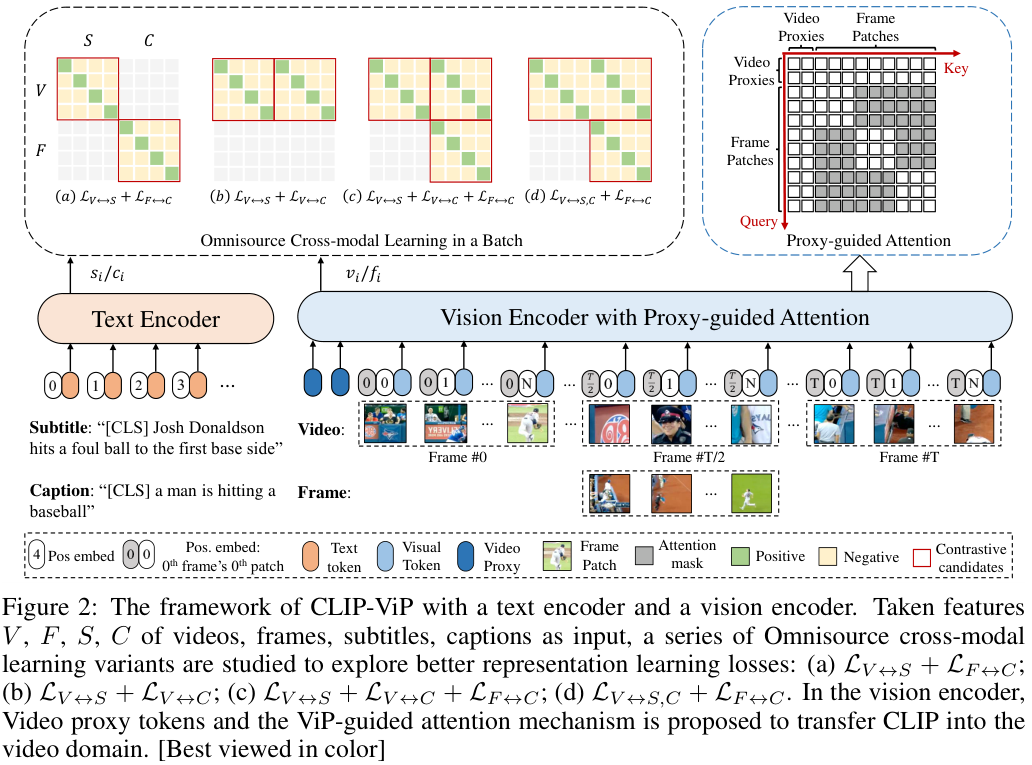 이러한 발견을 기반으로 video-text 에서의 post-pretraining을 위한 방법인 Omnisource Cross-modal Learning method equipped with a Video Proxy mechanism on the basis of CLIP, CLIP-ViP를 제안합니다. 이 방법을 통해 Text-Video Retrieval 성능이 크게 개선되었으며, SOTA를 달성할 수 있었다고 합니다.