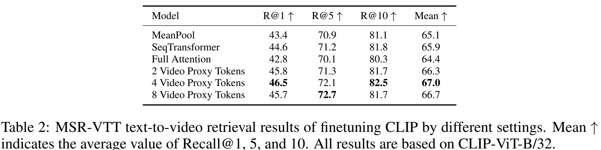 영상의 각 패치들의 시공간적 정보를 모델링하는 가장 단순한 방법은 모든 토큰을 한 번에 CLIP vision encoder에 입력하고 전체 토큰에 대한 어텐션을 수행하는 것이겠지만, CLIP이 이미지에서 학습되었기 때문에 이는 좋은 방법이 아니라고 합니다. (아래 표 2. 에서 비교를 수행하였습니다.) 때문에 저자들은 패치들이 기본적으로는 Image에서 그랬던 것처럼 spatial 한 정보들을 주고받되, 추가적인 Video Proxy token을 통해 각 프레임들이 temporal 정보를 주고받을 수 있게 하였습니다.