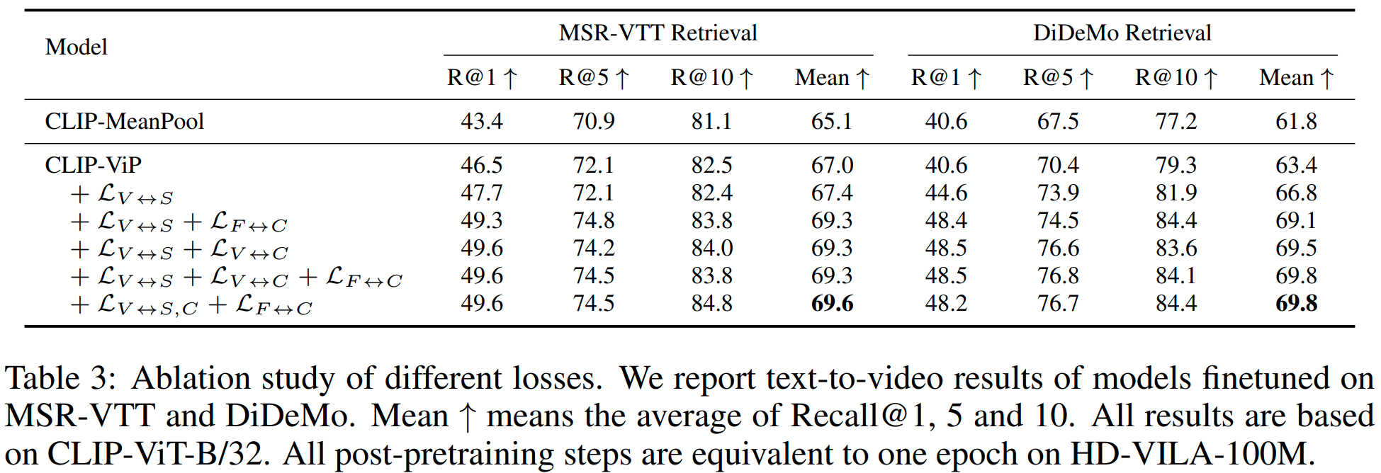$s_i\in S, c_i\in C$입니다.. $\mathcal L_{V\leftrightarrow S,C}$안의 $\mathcal L_{t2v}$는 (3)과 같습니다. 저자들은 이러한 변종들을 기본 baseline $\mathcal L_{V\leftrightarrow S}$과 비교하였습니다.