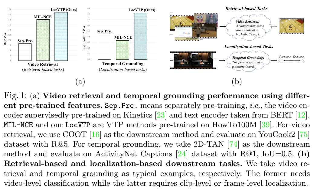 그러나 그림 1. 의 좌측에 나타난 것처럼, video retrieval, video captioning, video question answering과 같은 Video Retrieval 기반 task의 경우 MIL-NCE 기법으로 VTP 사전학습된 모델이 video encoder와 text encoder를 별도로 사전학습한 Separately Pre-trained 방법보다 좋은 성능을 보였지만, Localization 기반의 task에서는 오히려 안 좋지 않은 성능을 보이기도 하였는데요. 이는 temporal grounding, action segmentation, action step localization과 같은 localization 기반 task들이 프레임이나 클립 단위의 더 fine-grained 한 예측을 수행해야 하는데, 이에 기존 VTP 방법이 적합하지 않았기 때문이라고 합니다.