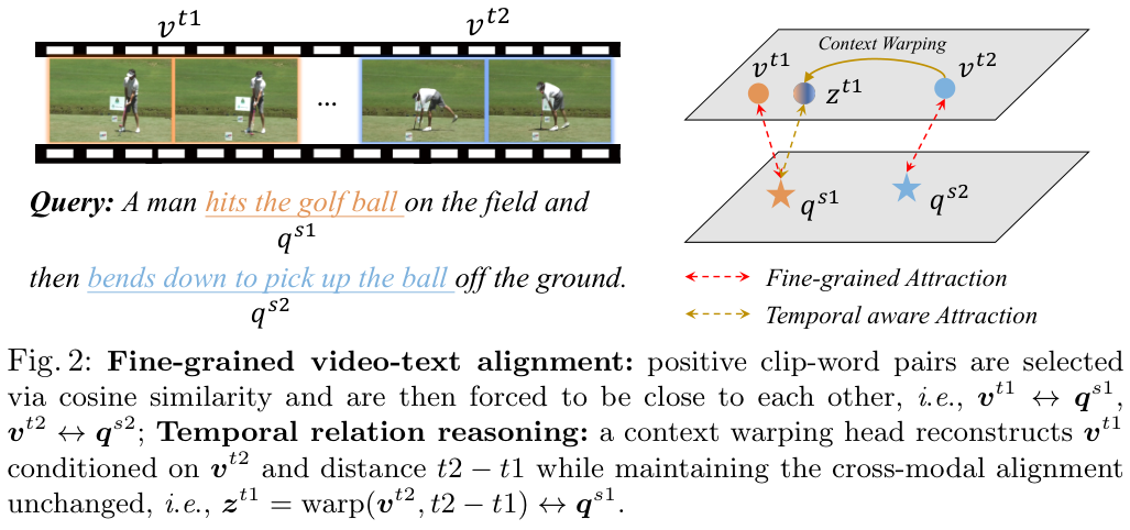 Context warping head. 이러한 문제를 극복하기 위해, 저자들은 비디오 클립의 context를 더 잘 감지할 수 있도록 context warping을 도입합니다. 앞서 구한 클립과 유사한 단어 쌍 $\{v^t, q^t_+\}$에 포함된 클립 $v^t$과 temporal distance $\delta$만큼 떨어진 클립 $v^{t+\delta}$을 이용해 $v^t$를 복원하는 context warping head $g(\cdot)$를 모델에 추가하여, 모델이 temporal cue에 대한 이해를 얻을 수 있도록 합니다. 모델은 $v^{t+\delta}$와 $\delta$로부터 원래 클립에 해당하는 $v^t$와 유사한 $z^t$를 복원하며 시간적인 이해를 얻게 됩니다.