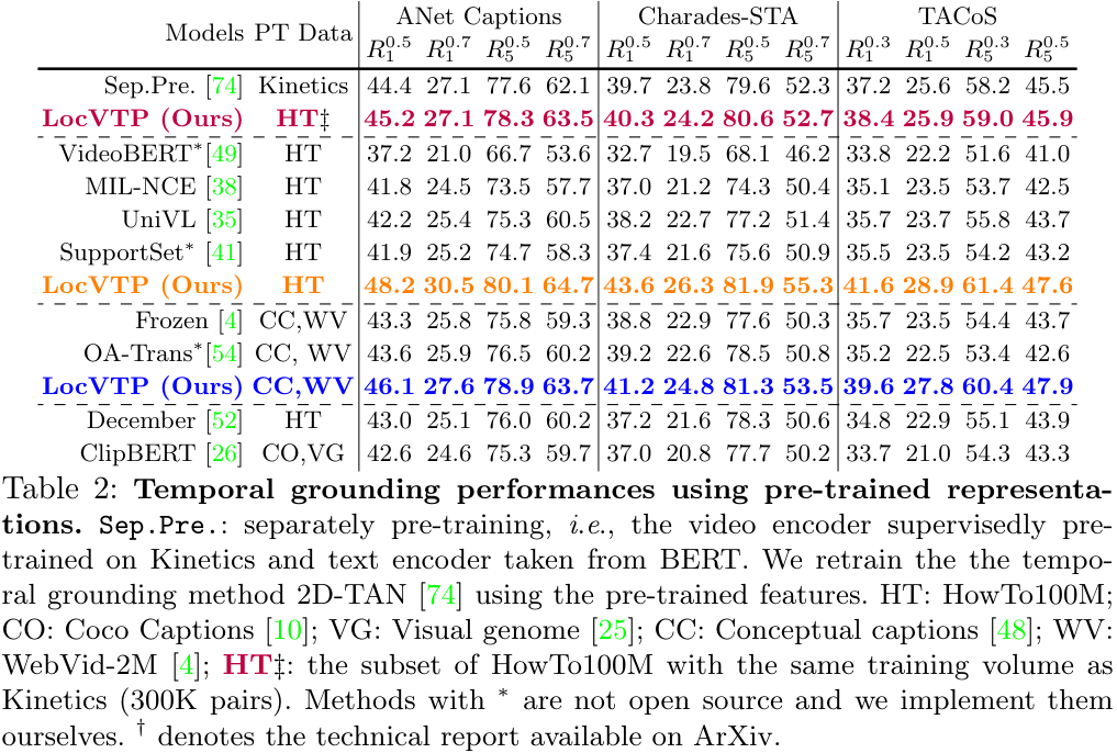 untrimmed video에서 주어진 문장과 일치하는 액션을 localize 하는 temporal grounding task에서의 성능을 측정했습니다. 저자들은 주류 temporal grounding 방법론인 2D-TAN의 입력 feature를 LocVTP의 사전학습 feature로 바꾸어 학습시키고, 다른 잘 알려진 VTP 방법론 중 코드가 공개된 것들을 이용해 비교를 수행하였습니다.