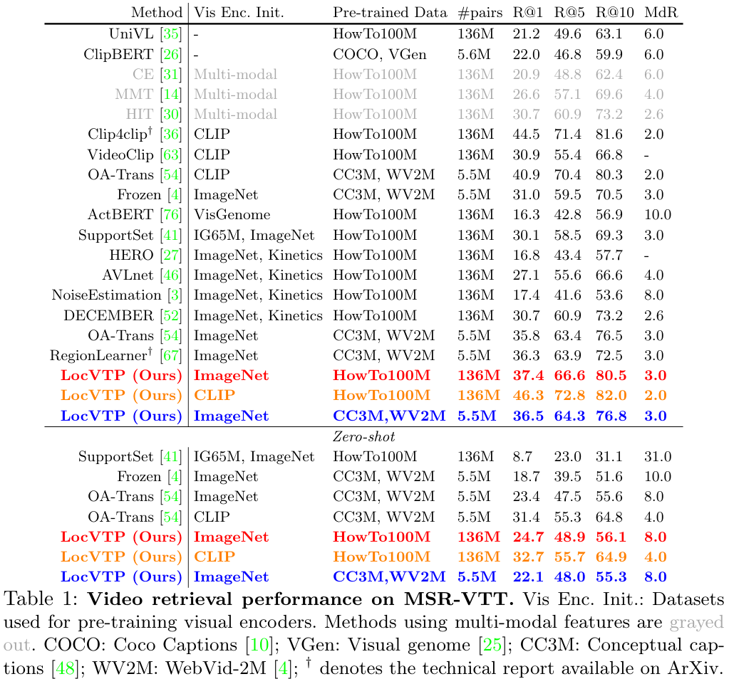 이러한 모델들은 k-means cluster나 graph auto-encoder를 사용하여 추가적인 오버헤드가 발생하는 반면, LocVTP는 명시적으로 clip-word matching을 모델링하여 더 가볍게 유사도 비교를 수행할 수 있다고 하네요.