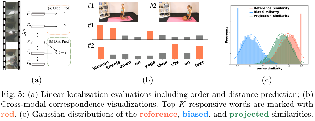 (f)는 기존 VTP 방법론인 UniVL과 MIL-NCE와의 비교를 수행하였는데, 아래 그림 5. 의 (a)와 같이 $n$개의 클립을 샘플링하여 frozen video backbone에 넣고, order prediction과 distance estimation을 수행하도록 하였습니다. 두 task 모두 temporal 한 target에 대한 예측을 수행하는 task인데요. 이때 $\mathcal L_t$를 사용한 경우와 그렇지 않은 경우를 비교하였습니다. (표에는 $\mathcal L_c$라고 오기되어 있습니다.) $\mathcal L_t$ 없이도 기존 방법론들을 앞서는 성능을 보이며, $\mathcal L_t$를 더하면 성능이 더욱 오르는 모습입니다.