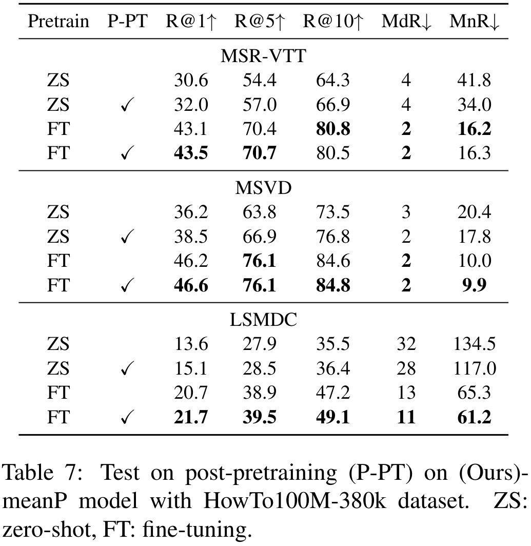 HowTo100M에서 post-pretraining을 수행한 후, target dataset에서 fine-tuning을 수행하였고, 이때 post-pretraining에 대한 실험을 HowTo100M에서 추출한 일부 데이터셋을 통해 추가적으로 진행했습니다. (아래에서 자세히 다루겠습니다.) post-pretraining은 parameter free 방식과 MIL-NCE loss로 진행하였고, Adam optimizer를 사용하였습니다. 이외에 하이퍼 파라미터는 learning rate $1e-8$, token length 32, frame length 12, batch size 48로 V100 8장에서 학습을 진행했다고 합니다. 5 에포크 학습에 2주일이 소요되었는데, 본 논문에서 수행한 post-pretraining 관련 연구를 추후 연구의 preliminaries로 활용할 수 있을 것이라 하네요. 확실히 다른 연구자들이 post-pretraining에 힘 뺄 필요가 없게 탄탄히 실험한 모습입니다.