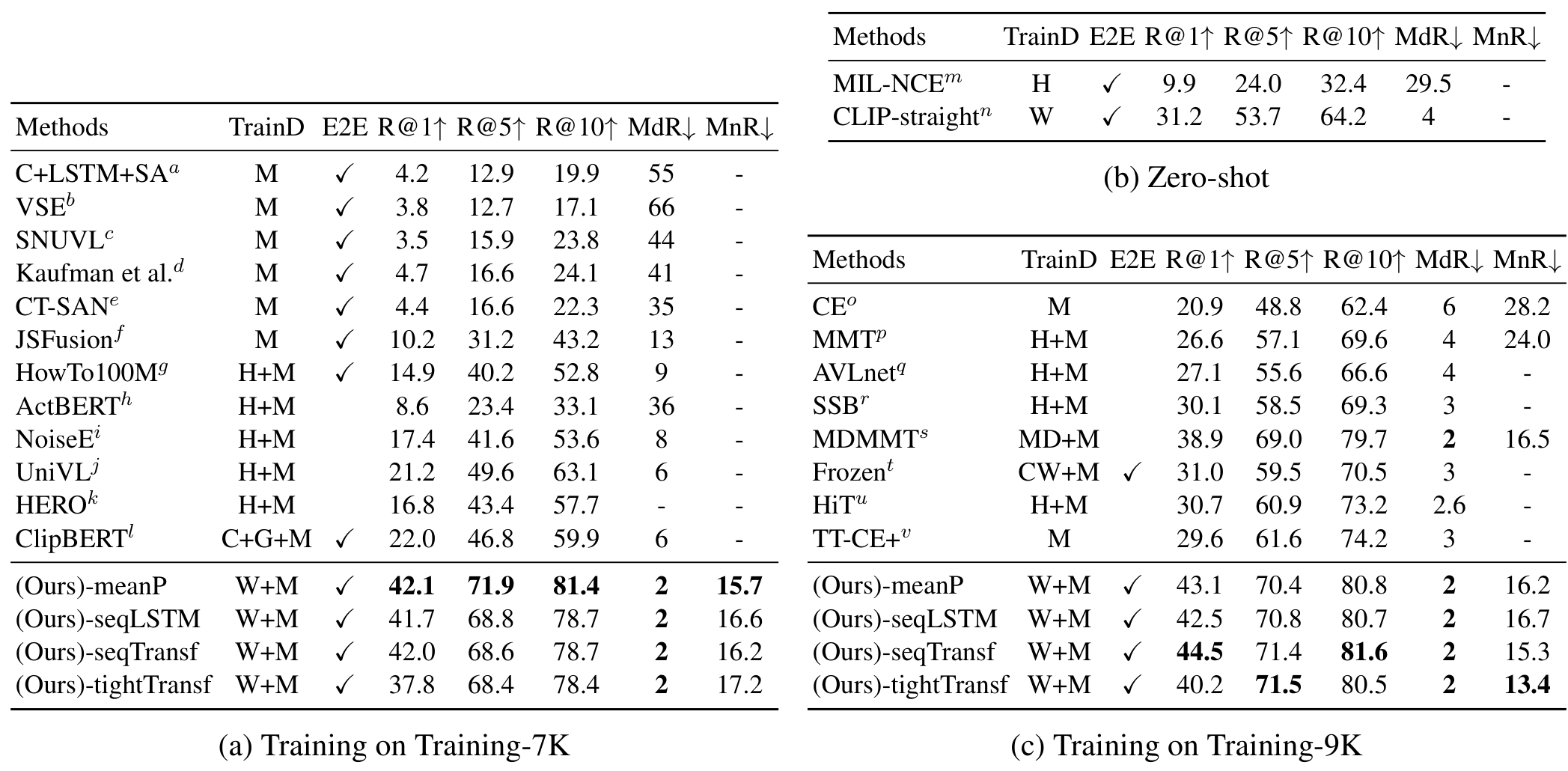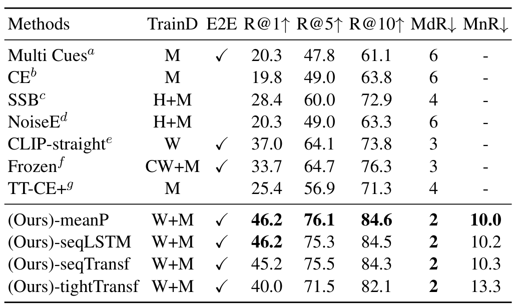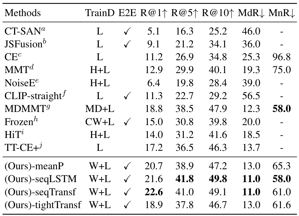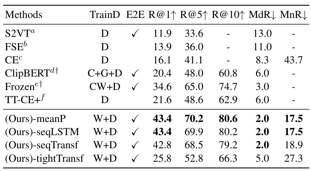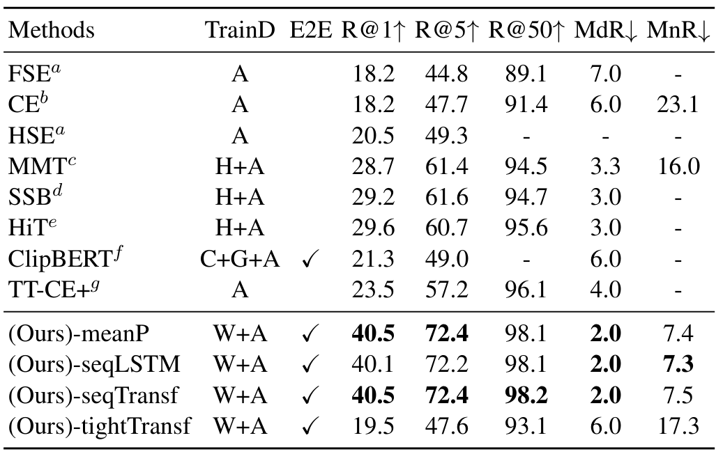 표에서 TrainD는 학습 데이터셋을 의미하는데, H는 HowTo100M, W는 CLIP 사전학습에 사용되는 WiT를 의미하며, 이외에는 각 모델이나 데이터셋 학습에 사용되는 다양한 데이터셋들을 의미합니다. 논문의 표 설명에 적혀있기는 하나 가독성을 위해 리뷰에 가져오지는 않았습니다.