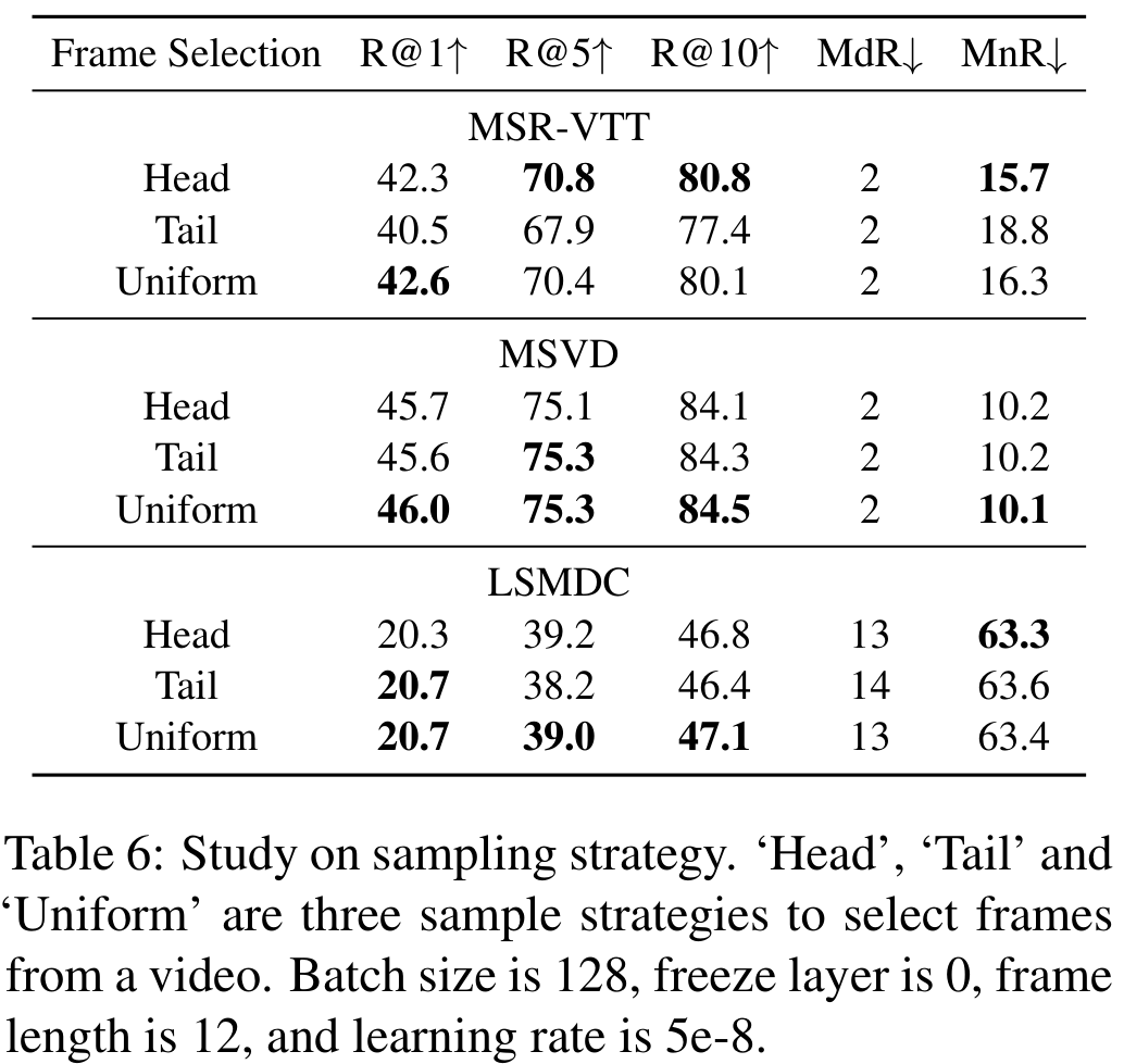 영상에서 1초에 1장의 프레임을 추출할 때, 정확히 어느 위치에서 추출하는 것이 좋은지에 대한 실험입니다. Head는 추출해야 할 프레임 중 첫 프레임, Tail은 마지막 프레임, Uniform은 균등한 추출, 즉 중심을 의미합니다. 최근에 저희 팀 연구 중에도 이에 대한 의문이 있었는데, 미리 이 논문을 봤으면 좋았을 걸 그랬네요.