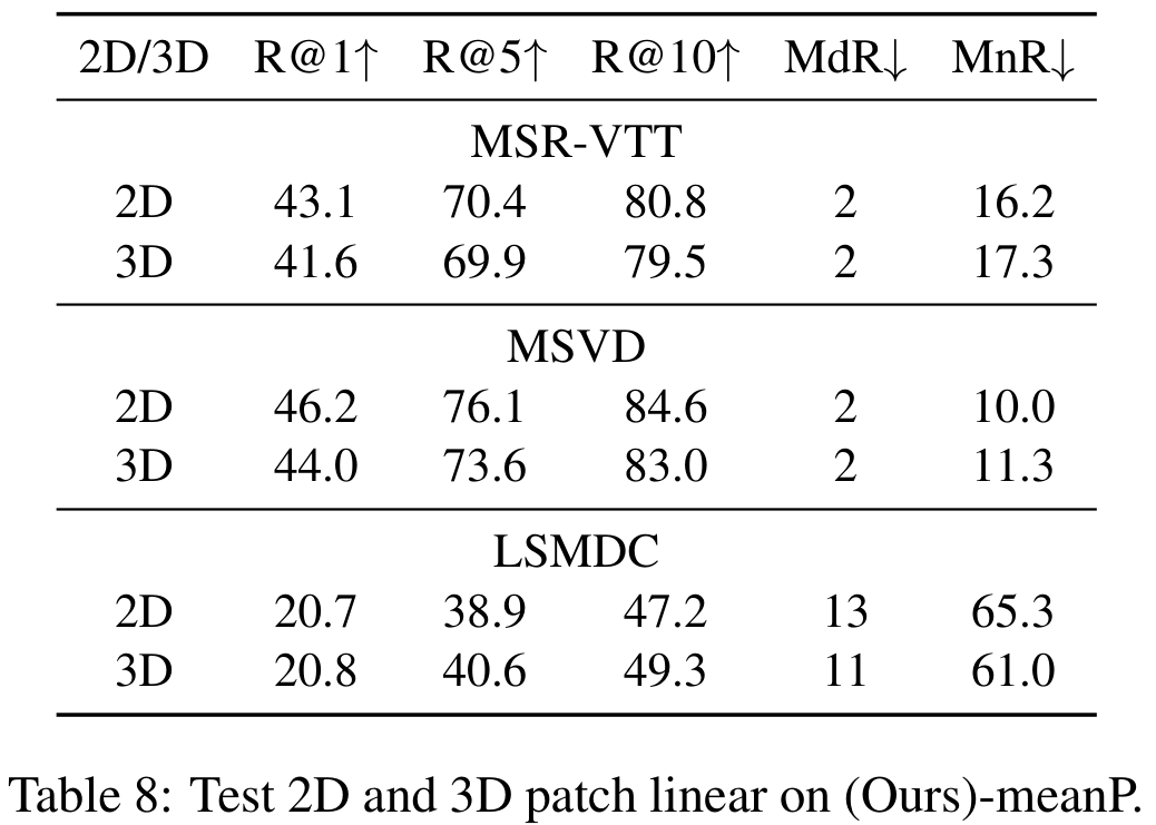 프레임을 visual encoder에 입력할 때, Linear Projection 과정에서 3D CNN을 통해 temporal modeling을 수행한 것에 대한 실험입니다. 의외로 2D가 더 나은 성능을 보였는데, 이는 CLIP이 2D Linear를 사용하는 것을 전제로 학습되어 그런 것으로 보인다고 합니다. 즉, 더 큰 데이터셋에서 잘 post-pretraining 하면 3D가 더 좋을 수도 있다는 것이죠.