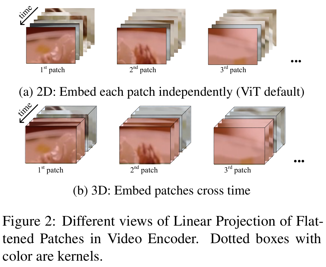 이때, Linear Projection에 사용되는 CNN은 기본적으로 2D CNN이지만, 저자들은 영상의 Temporal 한 정보를 modeling 하기 위하여 $[t\times h\times w]$의 kernel을 갖는 3D CNN을 사용하는 실험을 진행하였습니다.