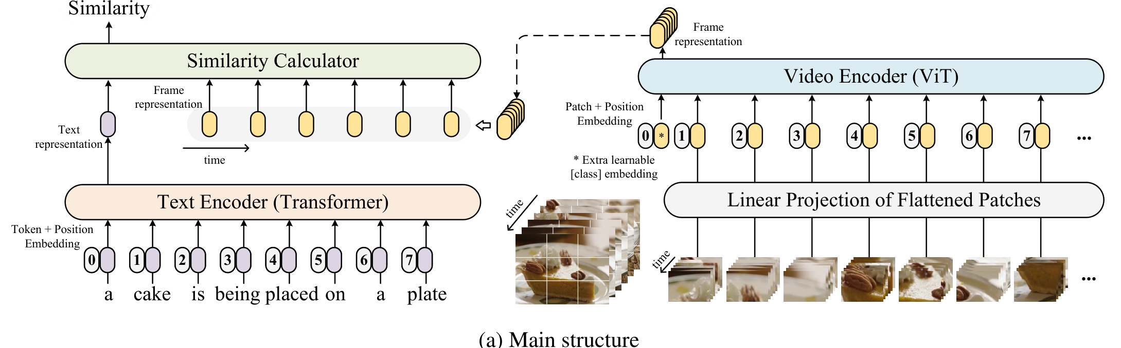 CLIP4Clip은 비디오를 입력 삼아 end-to-end(E2E)로 학습되며, 그림 1과 같이 video encoder, text encoder, similarity calculator로 구성됩니다.