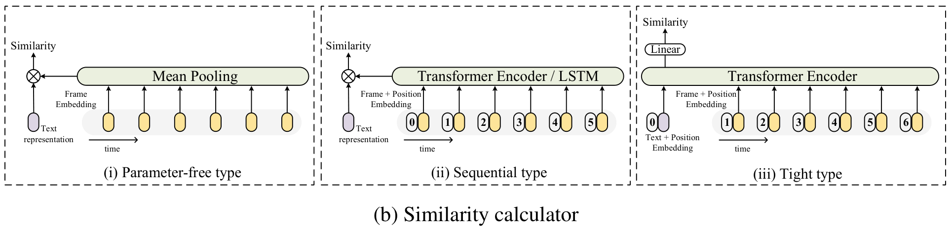 두 번째 방법은 Sequential type입니다. LSTM이나 트랜스포머 인코더를 통해, 프레임 벡터 $z_i$들에 대한 temporal modeling을 수행한 다음, mean pooling을 수행하여 코사인 유사도를 구합니다. 이때, 트랜스포머를 사용할 경우 position embedding $P$를 사용합니다.