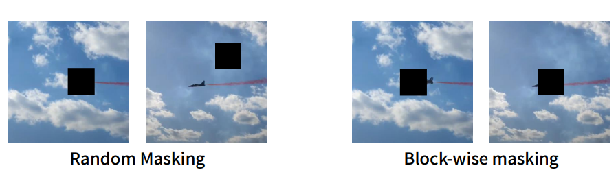 Video-block masking strategy. 비디오에 등장하는 물체는 대게 연속되는 프레임에서 유사한 위치에 존재하여, 시공간적 관점에서 튜브를 형성합니다. 따라서 비디오를 masking 할 때, information leakage를 막기 위하여 block-wise masking을 통해 비디오 속 모든 프레임에서 같은 위치들을 마스킹하였습니다. 저자들은 랜덤한 20%의 패치를 학습 가능한 마스크 토큰으로 변환하였다고 합니다. 학습 가능한 마스킹 토큰도 특이하네요.