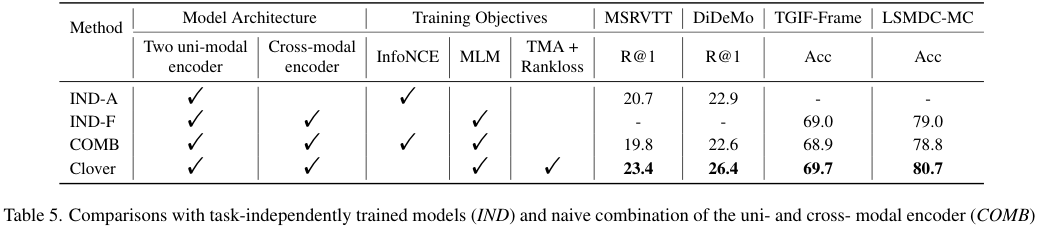 Clover makes cross-modal alignment and fusion mutually improving. Clover와 같은 구조를 가지지만 다른 사전학습 task를 가진 모델들과의 비교를 수행했다. IND-A는 cross-modal alignment를 InfoNCE Loss로만 학습한 결과이고 IND-F는 cross-modal fusion을 MLM으로만 학습한 결과이다. 멀티 모달 인코더를 단일 모달 인코더 위에 쌓아 COMB 방식으로 구성된 모델의 경우 오히려 성능이 감소하였다. Clover는 task에 맞게 학습된 IND-A, IND-F보다 좋은 성능을 보이며 Clover가 cross-modal alignment와 fusion 능력을 상호적으로 향상함을 알 수 있었습니다.