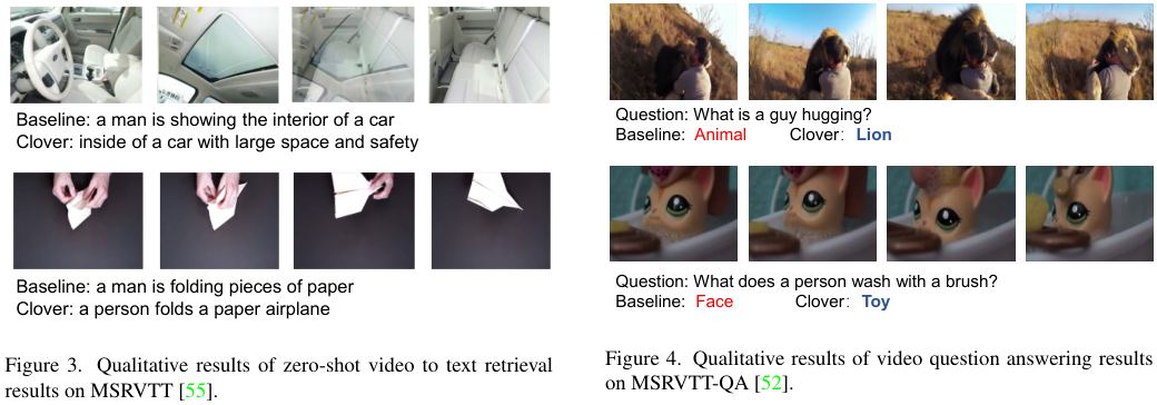 Qualitative analysis. 그림 3.을 보면, 주어진 비디오에 대하여 Clover가 단순히 종이를 접는 텍스트가 아니라 "종이비행기"를 포함한 텍스트를 상세히 retrieval 한 것을 확인할 수 있으며 그림 4. 에서도 질문에 대하여 베이스라인의 "Animal"보다 더 상세한 "Lion"을 답변한 것을 볼 수 있습니다.