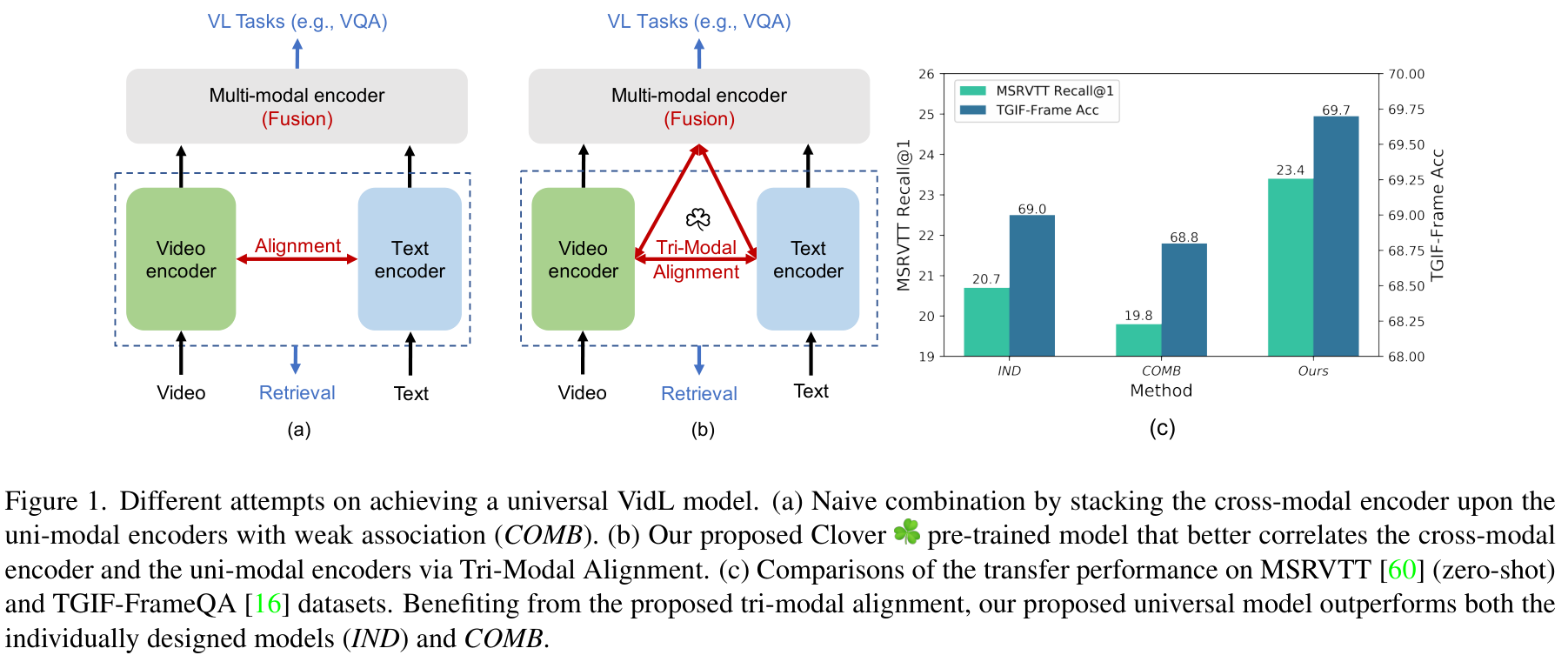 현존하는 VidL 사전학습 모델들은 pair-wise contrastive learning을 통해 모달리티 간의 임베딩을 align하는 반면, Clover는 Tri-Modal Alignment (TMA)를 통해 비디오와 텍스트 모달리티 뿐 아니라 그들의 퓨전 모달리티까지 align 합니다.