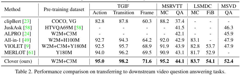 Video question answering. 다른 VQA 모델들에 비해 훨씬 적은 학습 데이터에도 불구하고, Clover가 가장 좋은 성능을 보여주었습니다. 특히, VQA를 위해 디자인된 대규모 데이터셋인 HTVQA69M, YTT180M을 사용한 JustAsk나 MERLOT 보다도 훨씬 적은 데이터로 좋은 성능을 보여주는 모습이 인상적이라 하네요.