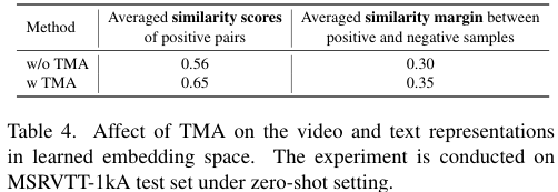 이어서 TMA 적용 여부에 따른 positive pair 간의 유사도 점수 평균과, positive pair, negative pair 간의 유사도 점수 차이의 평균을 구해보았는데 TMA를 적용한 경우 positive pair 간의 유사도 점수가 올라가고, positive pair와 negative pair의 구별력이 올랐다고 합니다. 이는 TMA를 통해 동일한 맥락 정보를 가진 비디오와 텍스트 간의 거리는 줄어들고, 그렇지 않은 경우 늘어난다는 것을 시사합니다.