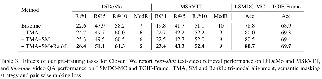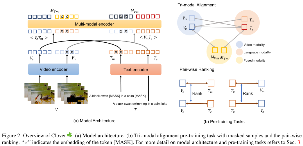 Clover는 비디오와 텍스트의 representation 뿐 아니라 이들이 융합된 멀티 모달 representation도 함께 align 하는 Tri-Modal Alignment (TMA)를 도입합니다. 이를 통해 멀티 모달 representation은 비디오와 텍스트 두 모달과 동시에 정렬되는데요. 때문에 비디오와 텍스트에 공통적으로 존재하는 일관된 맥락적 정보를 담게 됩니다. 한편, 비디오와 텍스트 representation 역시 이러한 멀티 모달 representation과 정렬되는 과정에서 멀티 모달 representation을 기준 삼아 더 잘 정렬되게 됩니다. 이러한 TMA는 기존의 pre-training task들 (Masked Language Modeling 등)과 합치기에 용이하며, 컴퓨팅 오버헤드도 무시할 만합니다.