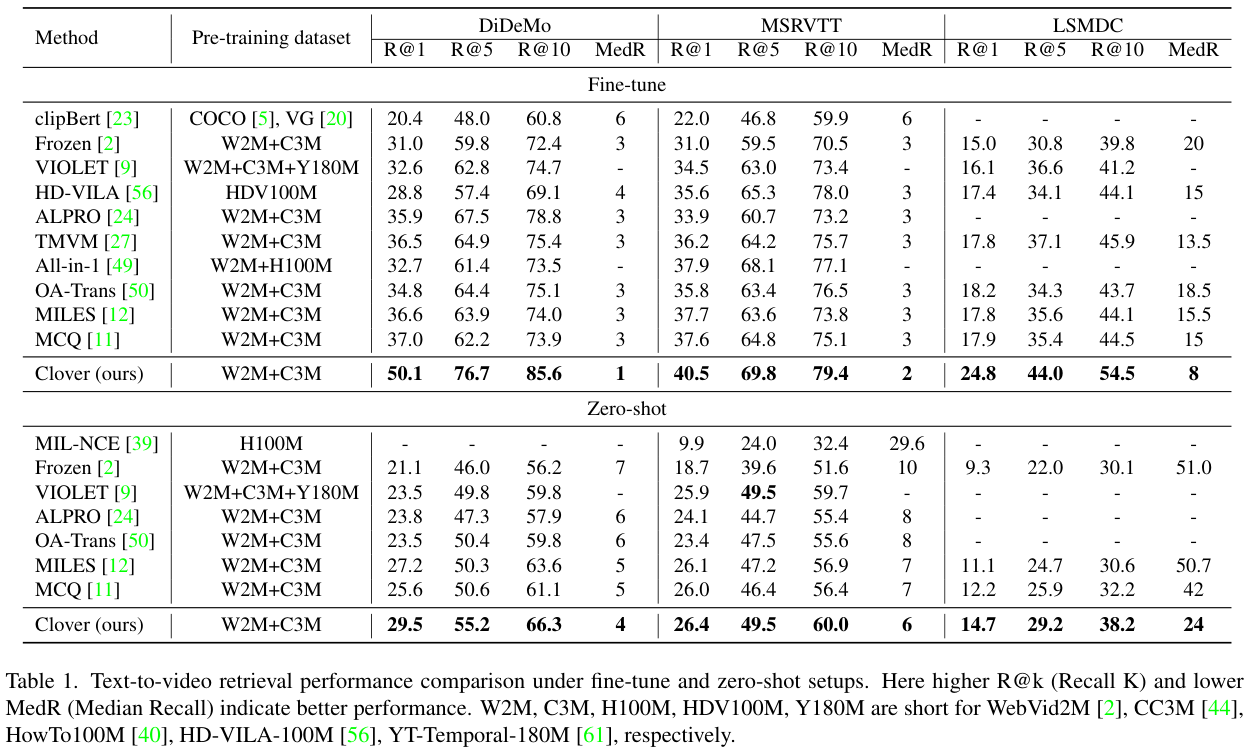 제가 일전에 리뷰한 Revisiting Temporal Modeling for CLIP-based Image-to-Video Knowledge Transferring (CVPR 2023)을 보면, Retrieval task에서의 비교가 잘 되어 있는데, Clover가 CLIP 기반 방법 중 하위권의 모델들과 비슷하거나 약간 모자란 성능을 보이고 있으며, CLIP을 사용한 방법 중 최신 방법론들보다는 조금 많이 아쉬운 성능을 보여주고 있는 것을 확인할 수 있었습니다.