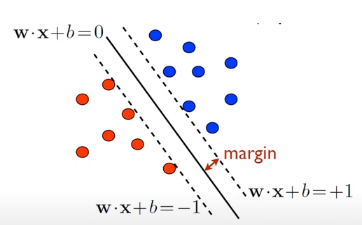 위 그림에서, 파란색 샘플들의 클래스가 $y_i=1$이고 빨간색 샘플들의 클래스가 $y_i=-1$이라고 하면, 모든 샘플이 $y_i(wx+b) \geq 1$을 만족한다.