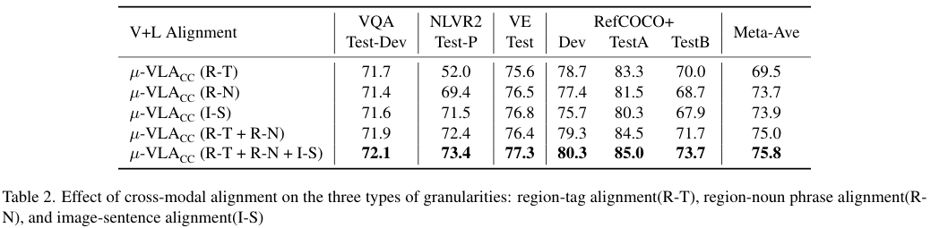 앞서 제안한 3가지 단계의 alignment의 실효성을 보이기 위한 비교 실험 결과입니다. 이미지 속 영역과 객체 태그 (R-T) 혹은 명사구 (R-N)와의 관계를 학습하는 것이 특히 객체에 대한 이해를 요구하는 RefCOCO+ 데이터셋에서는 도움이 되는 모습입니다. 한편, 이미지와 문장을 instance-level로 매칭하는 (I-S)는 NLVR2와 VE의 성능을 향상합니다. 이러한 결과는 전체적으로 아무리 약한 align이라도 주어진느 것이 각 downstream task 성능에 큰 영향을 준다는 것을 시사합니다.