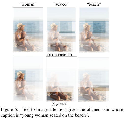 한편, CC와 BC라는 별도의 데이터셋에서 얻은 이미지, 텍스트로 학습한 $\mu-\text{VLA}_{BC}$도 U-VisualBERT와 견줄만하거나 더 좋은 성능을 보이면서 제안한 모델이 실용적이기도 함을 볼 수 있었습니다.