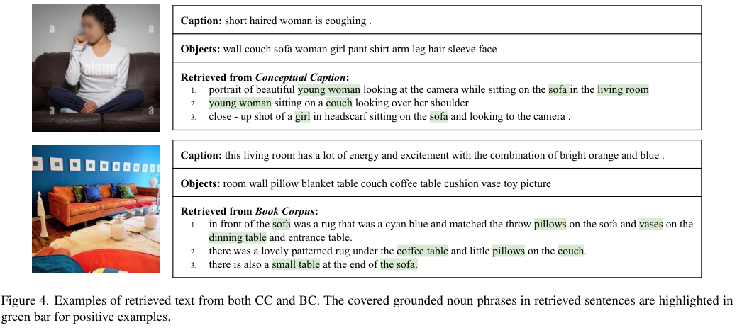 위 사진은 주어진 이미지와 매칭할 후보 텍스트를 CC, BC 데이터셋에서 retrieve 한 결과입니다. 표에서 맨 첫번째 줄은 실제 CC 데이터셋에서 이미지와 매칭되어 있는 텍스트 (즉 GT), 두번째는 VinVL로 검출한 객체, 마지막은 각 데이터셋에서 retrieve한 결과입니다. 위의 예시에서 CC 데이터셋의 텍스트로부터 "young woman"과 "sofa" 등이 들어간 문장들을 잘 가져온 것뿐만 아니라, 아래 예시에서 CC 데이터셋이 아닌 BC 데이터셋에서도 적절한 텍스트를 잘 가져오는 모습을 볼 수 있습니다.