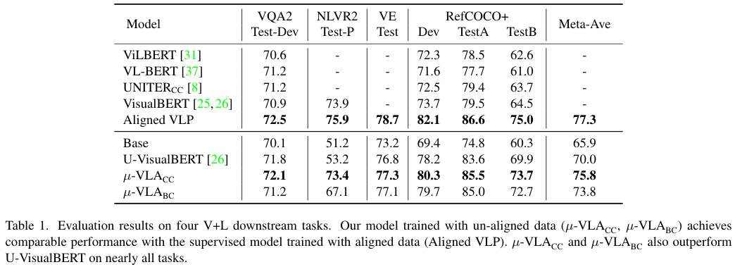 제안된 방법을 4가지 downstream task와 각 task에서의 성능을 모두 반영한 Meta-Ave 점수로 비교한 결과, 제안된 방법이 모든 task에서 Base를 앞서는 성능을 보였습니다. Supervised VLP와 비교해 보면, VilBERT를 크게 앞선 결과를 보였으나 이는 VinVL이라는 더 좋은 visual regional feature를 사용하였기 때문으로 볼 수도 있다고 합니다. 다만 $\mu-\text{VLA}$와 비슷한 구조의 Aligned VLP와 비교했을 때 그렇게 낮지 않은 성능을 보여 제안한 방법이 parallel 이미지-텍스트 데이터 없이도 supervisied 방법에 근접할 정도로 좋은 성능을 보였다고 합니다. 한편 기존 Weakly supervised 방법과 비교할 경우에도 좋은 성능을 보였는데, 특히 이미지와 문장 간의 align에 민감한 NLVR2 task에서 20% 이상의 성능 향상을 보여주어 제안된 모델이 parallel 데이터 없이도 이러한 instance-level cross-modal alignment를 잘 학습할 수 있음을 보였습니다.