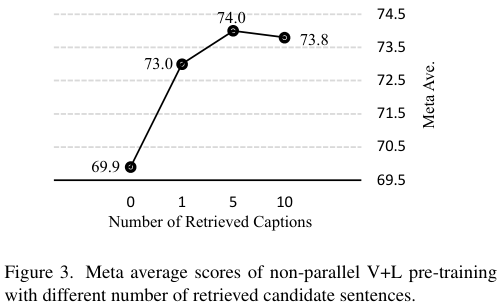 한편, 한 이미지당 retrieve 되는 후보 텍스트의 수에 따른 비교도 진행하였는데요. 이는 전체 데이터셋의 크기에 따라 다를 것 같은데, CC 데이터셋에서는 5가 최고의 성능을 보였다고 합니다. 특히, 2개 이상의 후보 텍스트를 사용하는 것이 좋은데, 그 이유는 검색에 활용되는 객체 태그와 후보 텍스트 간의 유사도가 높다는 것이 언제나 두 모달이 의미론적으로 유사함을 보장하지는 않기 때문에, 몇 개의 다른 후보 텍스트가 있는 것이 도움이 되는 것 같다고 합니다.