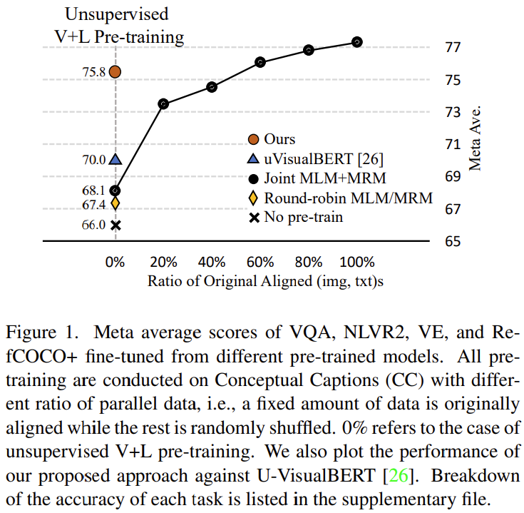네 가지 task에서의 성능 평균을 비교한 결과가 그림 1. 에 나타나있는데, Joint MLM+MRM이 Round-robin MLM/MRM 보다 확연히 높은 성능을 보여 입력되는 이미지와 텍스트가 정렬되어 있지 않더라도 함께 입력하는 것이 WVLP에서 좋음을 볼 수 있었습니다. 또한, 학습 데이터 중 정렬된 데이터의 비율에 따라 성능이 확연하게 올라, 정렬된 데이터 쌍이 많을 수록 성능이 오르는 것이 자명함을 보였습니다.