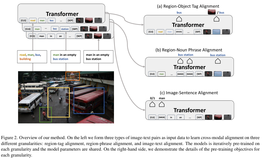 저자들이 제안한 $\mu-\text{VLA}$ 프레임워크는 non-parallel 한 이미지, 텍스트 데이터셋으로부터 weakly aligned 이미지-텍스트 corpus를 구성하는 부분과 모델이 영역(region)-태그 (RT), 영역-명사구 (RN), 이미지-문장 (IS)의 세 가지 수준에서 cross-modal alignment를 학습하도록 하는 사전학습 커리큘럼 두 가지로 구성됩니다.