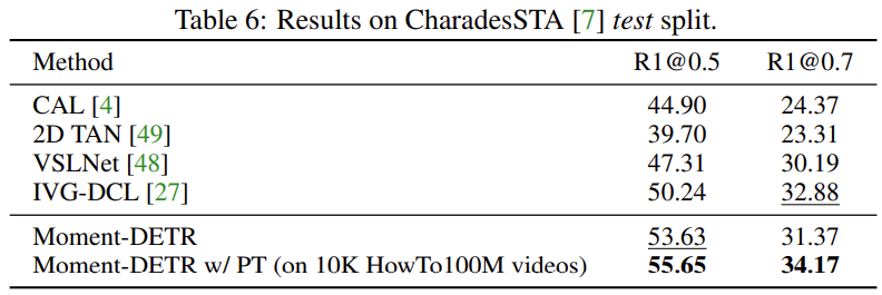 베이스라인 모델 중 가장 좋은 모델인 XML+와 비교했을 때, Moment-DETR은 moment retrieval에서 비슷한 성능을 보였고, 특히 IoU 임계값이 낮을 때 좋은 결과, 높을 때 나쁜 결과를 보였습니다. 이는 모델이 실제 moment와 가까운 영역을 찾기는 하지만, 구간을 아주 정확하게 만들지는 못하고 있음을 나타냅니다. (detection으로 따지면 물체를 잘 찾기는 하는데, bounding box의 크기가 형편없다고 보시면 될 것 같습니다.) 저자들은 이것이 L1과 generalized IoU loss에 의해 mismatch에 큰 penalty가 부여되기 때문인 것 같다고 합니다. 이는 DETR에서도 유사하게 발생하는 문제라고 하네요. 한편 highlight detection에서 역시 Moment-DETR과 XML+이 비슷한 성능을 보여주는데, 이는 어쩌면 Moment-DETR이 human prior 없이 학습되고 예측하기 때문에, 제대로 된 성능을 발휘하려면 더 많은 학습 데이터가 요구되는 것일 수도 있다고 합니다. 따라서 저자들은 ASR caption 기반의 사전학습을 진행하였고, 그 결과 두 task 모두에서 Moment-DETR이 baseline을 크게 앞서는 성능을 보여주었습니다. 한편 저자들은 CLIP이 highlight detection의 HIT@1에서 가장 높은 성능을 보임을 발견하였는데, 여기에 대해 놀랍다는 것 외에는 별다른 분석을 보이지 않고 있습니다.