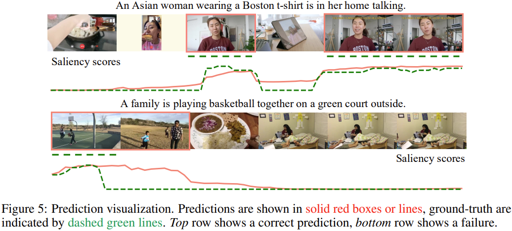 Prediction visualization. 정성적 결과입니다. 초록색 선이 GT이고, 붉은 선이 예측인데, 위쪽 결과는 예측을 잘한 모습이지만 아래의 경우, 가족들이 바깥에서 놀고는 있으나 농구를 하고 있지는 않은데, score를 높게 준 오답 예시입니다. 정성적 결과에 오답을 제시한 논문은 오랜만에 보는 것 같네요. 근데 또 이해가 가는 오답이라서, 오히려 논문에 대한 평가가 안 좋아지지는 않는 것 같습니다.