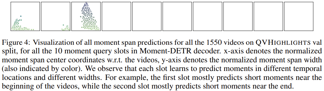 Moment query analysis. 위 그림은 QVHIGHLIGHTS에 속한 1550개의 validation 영상에 대하여 Moment-DETR의 10개 moment query slot의 moment span prediction을 시각화한 것입니다. 각 상자는 10개의 slot을 나타내고, 각 상자의 x 축은 moment center의 위치, y 축은 moment의 너비를 의미합니다. 시각화를 보면 각 slot이 주로 생성하는 예측의 위치와 너비가 다름을 알 수 있습니다. 첫 번째와 두 번째 slot은 주로 짧은 moment를 찾은 반면, 세 번째 slot은 긴 moment들을 많이 찾았습니다. 대부분의 slot이 짧은 moment를 찾도록 학습된 셈인데, 이는 데이터셋에 long moment가 많지 않기 때문으로 보인다고 합니다.