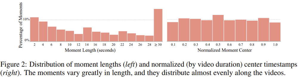 위 그림에서는 데이터셋에 존재하는 moment가 다양한 길이, 다양한 위치에 분포되어 있음을 확인할 수 있습니다. 이로써 저자들이 주장한 대로 temporal bias도 적다는 것이 드러났네요.